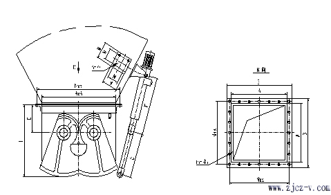 鄂式闸门主要由阀体、阀轴、扇形阀板、销齿齿轮及曲柄机构、电液动推杆或(电动推杆、)组成,采用优质钢板焊接结构、具有体积小、重量轻、阻力小。工作时,电液动推杆的直线往复运动,通过曲柄带动阀轴齿轮,使两个阀板作相对角度的摆动,从而达到控制物料之目的。